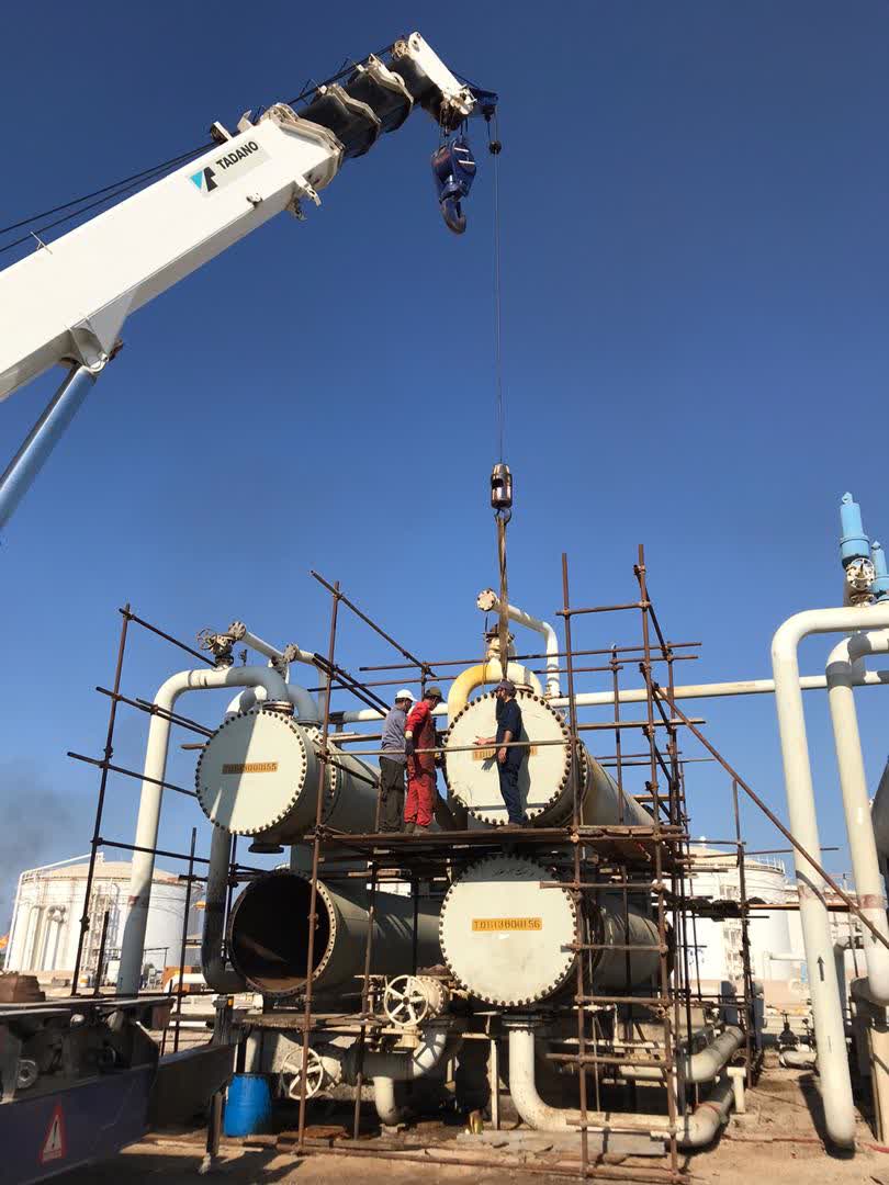 10- تعمیرات اساسی و تعویض تیوب 8 دستگاه مبدل حرارتی نفت به نفت طول هر دستگاه 9 متر و قطر دستگاه 64 اینچ هر دستگاه 2,080 عدد تیوب در شرکت نفت فلات قاره ایران منطقه سیری.